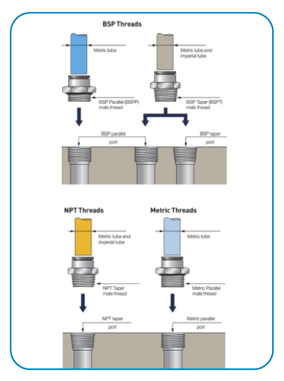 Identify thread type where system will connect. Example: BSPP 1/8”, NPT 1/8”, M8x1.