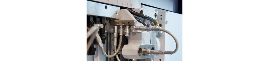 Coolant distribution system with flexible tubes braided in stainless steel, quick connectors, copper tubes, adaptors and distribution blocks in 2 different size programs for medium and high pressure. Ideal for both sliding and fixed headstock CNC lathes, multi-spindle lathes or transfer machines.